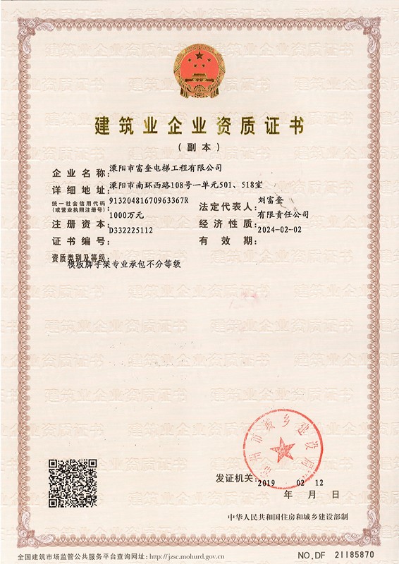 溧陽(yáng)市富奎電梯工程有限公司 溧陽(yáng)市富奎電梯工程有限公司是于二OO八年一月九日在原前身溧陽(yáng)市電梯工程公司基礎上成立的,是專(zhuān)業(yè)從事電梯銷(xiāo)售安裝維修、保養的企業(yè)。是國家質(zhì)監總局頒發(fā)的特種設備安裝、改造、維修A級安裝許可證單位。公司組織機構實(shí)行總經(jīng)理負責制,公司下設管理部、銷(xiāo)售部、安裝維修部、質(zhì)安部、財務(wù)部,公司另外設十二個(gè)分公司:四川分公司、江蘇分公司、上海分公司、浙江分公司、湖南分公司、遼寧分公司、山東分...